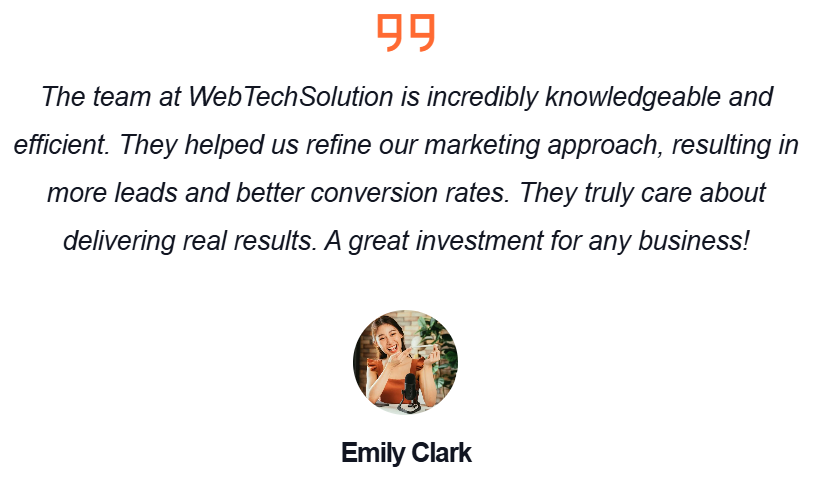 Choosing WebTech Solutions means partnering with a team of experts dedicated to driving digital success for your business. With 12+ years of experience across various industries, we use advanced strategies in SEO, social media marketing, PPC, and content creation to deliver measurable results. Our personalized approach ensures that every campaign is tailored to unique needs of clients, maximizing their ROIs.